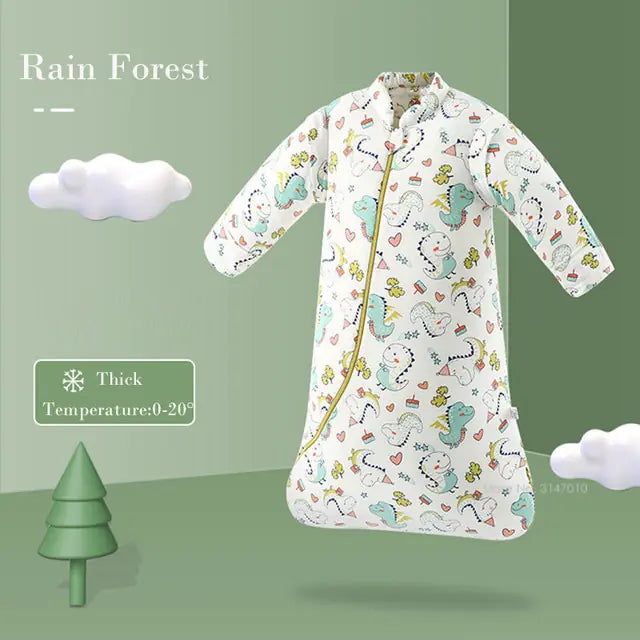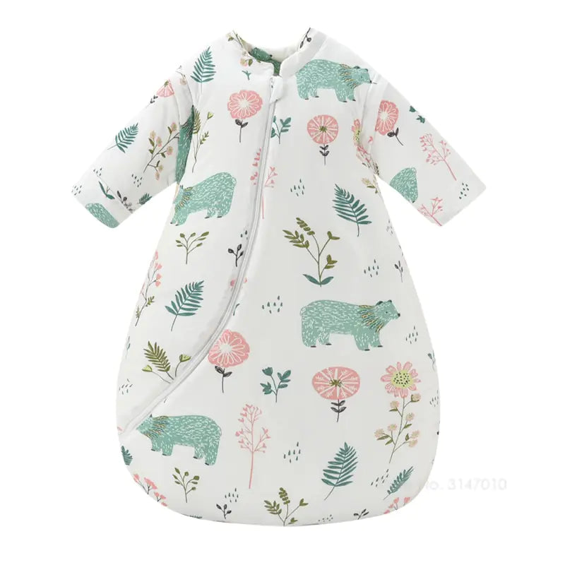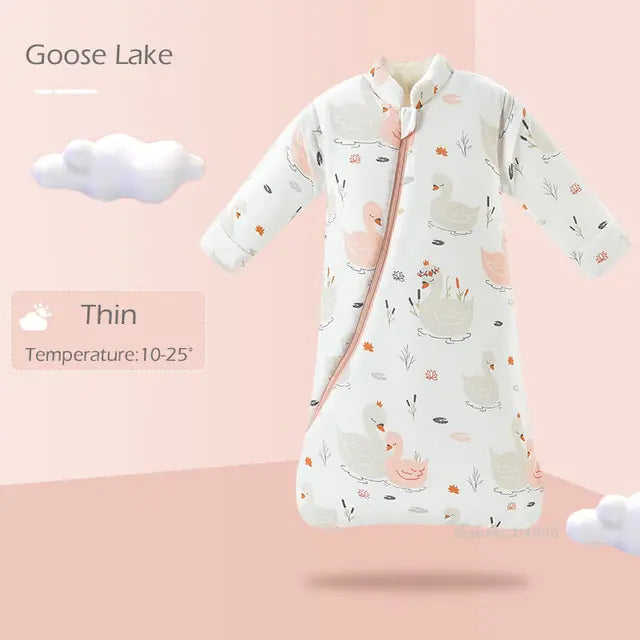 Designed with practicality and convenience in mind, our blanket features a zipper closure and detachable sleeves, allowing for easy on/off access and customizable warmth to suit your baby's needs. The bottom zip ensures hassle-free diaper changes, making nighttime routines a breeze for both baby and parent.